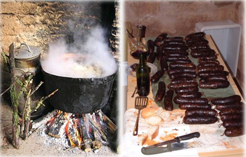 Para la cena, nuevo banquete: carne, morcillas, un poco de todo. Ese día, no podía faltar el vino, copa de orujo o anís, tabaco.